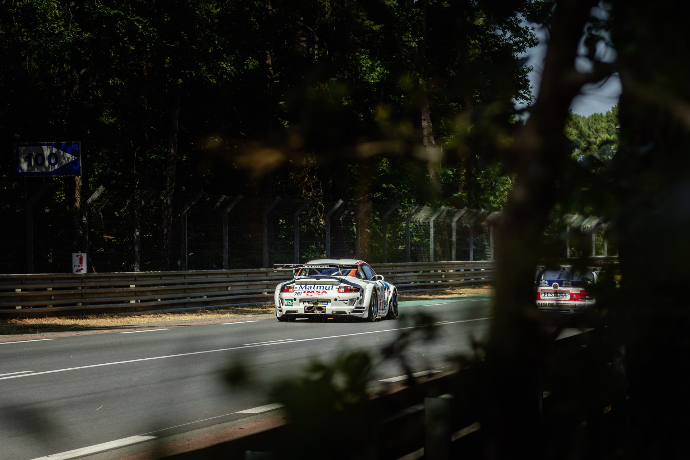 Mais retour à la réalité, redescente vers les virages quand un collègue me lance “qui dit coucher de soleil au Mans dit drapeau rouge en piste”. Un dicton… 3 minutes plus tard les panneaux des commissaires s’allument, fin de session le drapeau rouge est de sortie. Bon, certains dictons ne sont pas que des légendes apparemment. On apprend assez vite que, les deux DBR9 se sont accrochées 500 mètres plus bas et sévèrement puis qu’une des deux termine sur le toit sans blessure pour les pilotes.