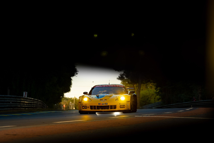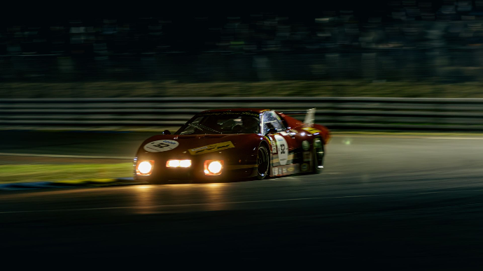 De notre côté nous profitons du drapeau rouge pour continuer notre descente vers Arnage et profiter du début du plateau 4 qui entre en piste. Les GT40 crachent des flammes tandis que les pilotes s’habituent à la pénombre ambiante. La nuit tombe, les voitures rentrent et de notre côté nous devions rentrer au niveau des paddocks pour faire des photos d’ambiance. Mais c’était sans compter sur l’aiguille qui tourne un peu trop vite. La décision est prise de faire le plateau 5 au même endroit et c’est ainsi l’occasion de voir à nouveau les Lola et Chevron batailler en piste mais cette fois ci dans le noir.